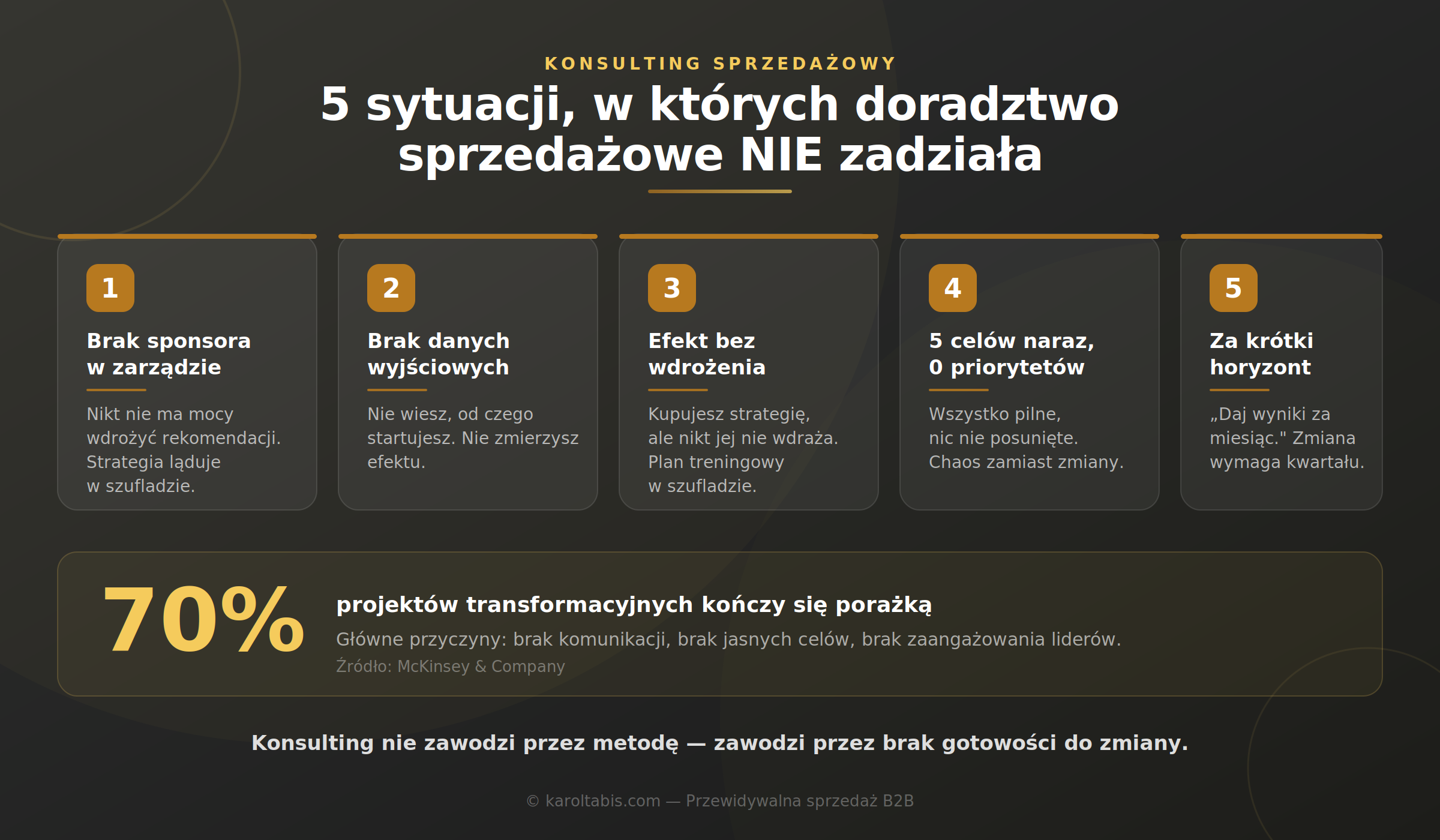 ![Konsulting sprzedażowy — kiedy NIE działa i jak tego uniknąć [2026] 5 4 warunki gotowości na konsulting sprzedażowy B2B — cel, sponsor, dane, czas](https://www.karoltabis.com/wp-content/uploads/2026/04/konsulting-sprzedazowy-4-warunki-gotowosci.png)